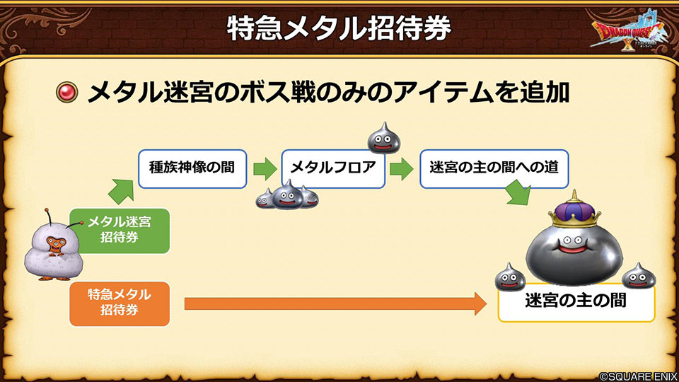 ・ボス戦のみのメタル迷宮が登場。途中のフロアが無いので時間が大幅に短縮されて、破格の経験値を稼ぐことが可能
